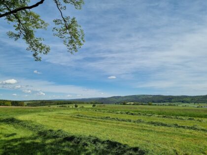 Es ist eine zweigeteilte Wanderung. Auf den ersten Kilometern viele wie in der Luft aufgehängte Wiesenpfade, mitunter am Waldrand oder an Äckern entlang, später dann jede Menge Wald.