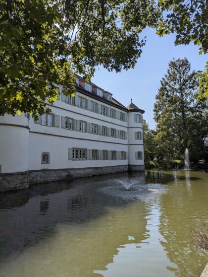 Woran wir uns erinnern werden nach dieser Wanderung – an dieses eigenartig entrückt wirkende helle Schloss auf einem Einzelhügel, der aussieht wie ein mit der Landschaft verwachsener Schildkrötenpanzer, an den Kontrast zwischen dem matten Licht über der Landschaft, das die Wege und die Bäume beinahe schwärzlich erscheinen lässt, und dem satten Grün der Wiesen, und nicht zuletzt an Weinberghänge oberhalb von Dörfern, in denen nicht die geringste Bewegung zu erkennen ist.