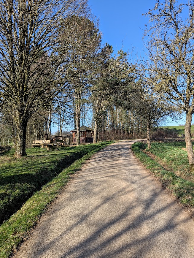 Ich beginne die Wanderung nicht direkt bei der Höchstener Kapelle, sondern oberhalb des Lebacher Stadtteils Thalexweiler. Die Kälte wird noch etwas verstärkt durch den beinahe ununterbrochen wehenden eisigen Wind. Der erste Teil der Strecke führt meist bergan, um die Kapelle herum mit ungefähr 15 Prozent Steigung.