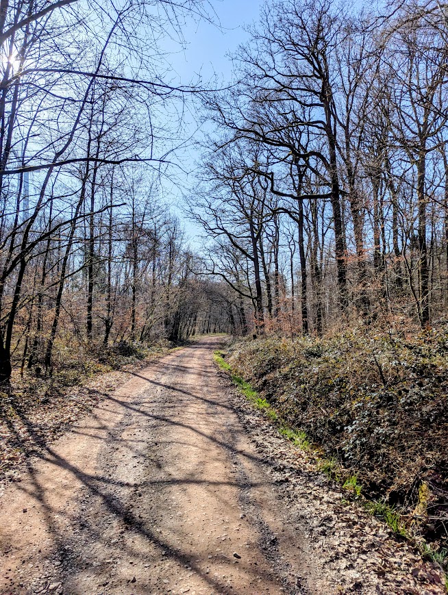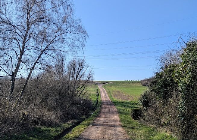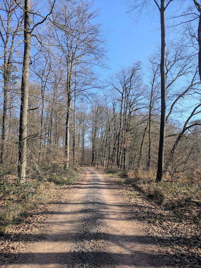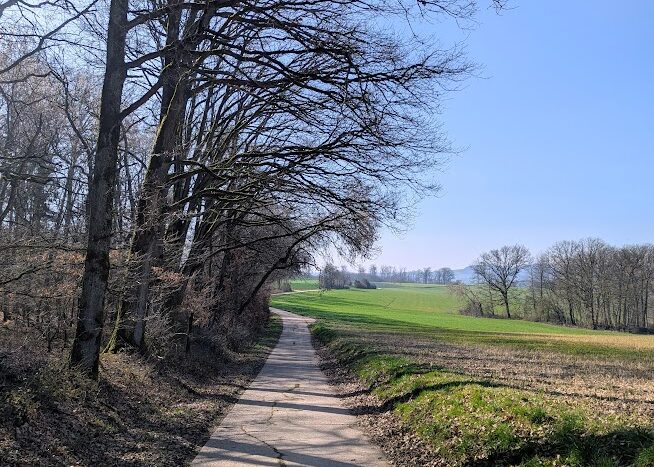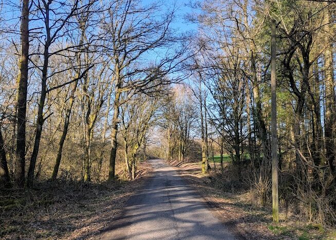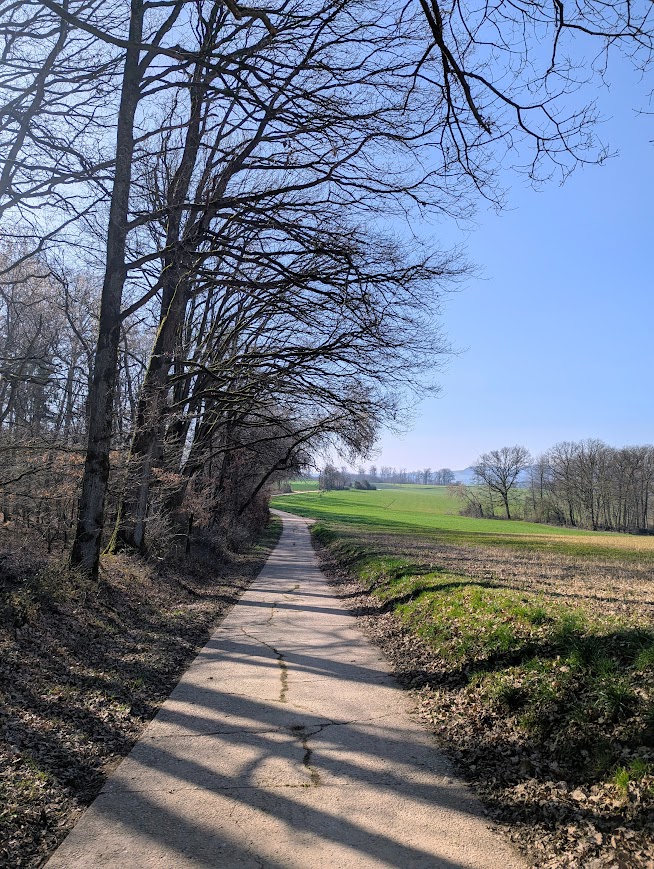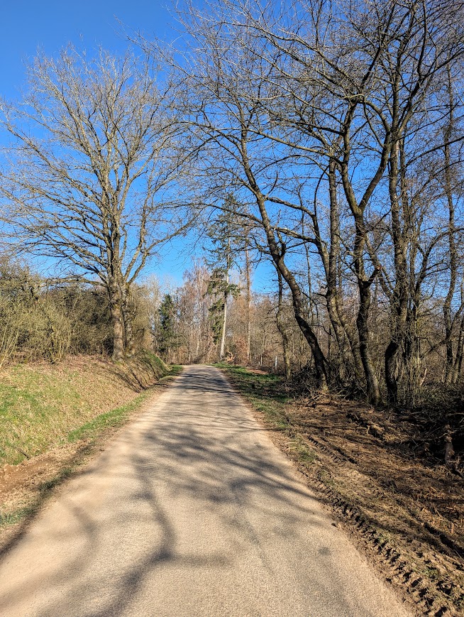 Viele Äcker und Weiden säumen den Weg, immer wieder laufe ich aber auch durch lichten, von der Sonne erhellten Winterwald.