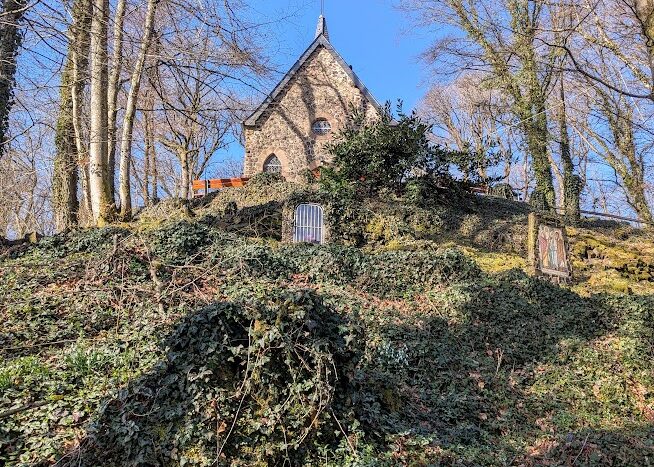 Blick von unten auf die Kapelle. Über einen kurzen Serpentinenpfad gelangt man hinauf.