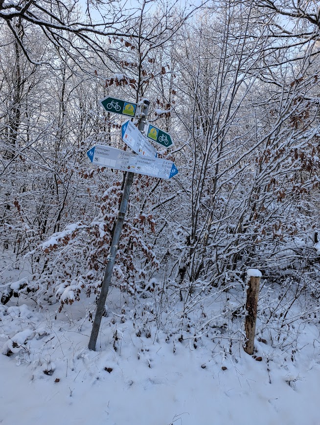 Ich starte am Rande des Dirminger Waldes, eines recht weitläufigen Waldgebietes mit zahlreichen Verästelungen von Wegen und Pfaden. Diese Schilder hier haben auch schon bessere Tage gesehen, aber ungefähr in dieser schiefen Lage halten sie sich bereits seit einigen Jahren.