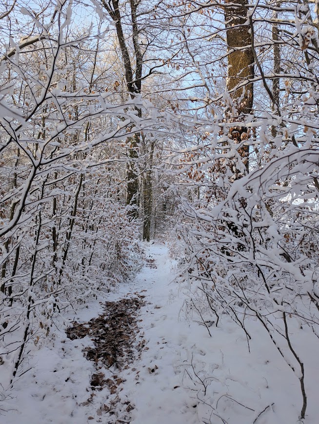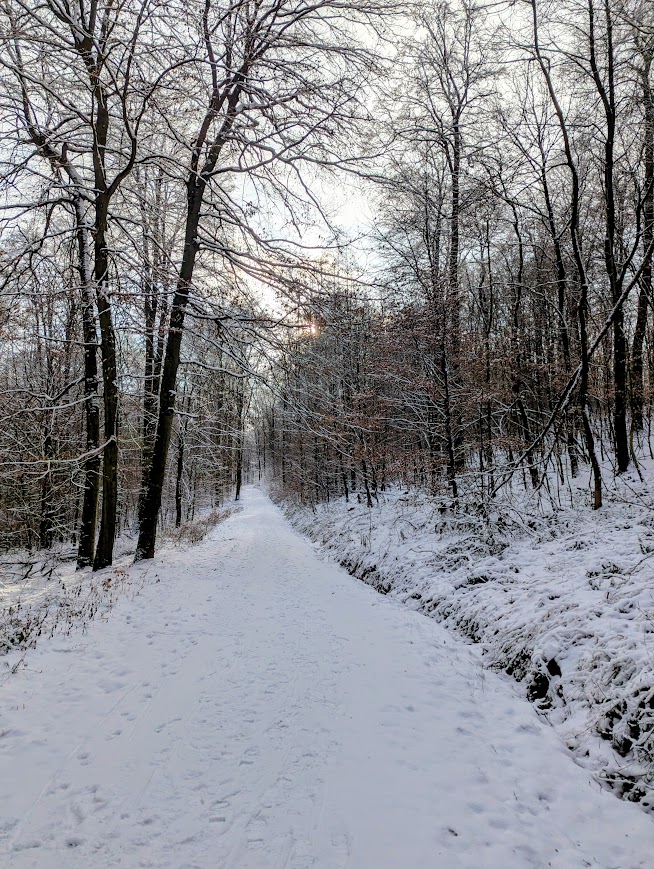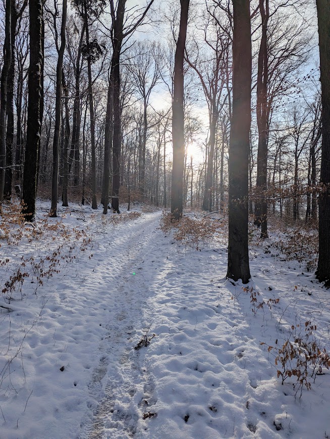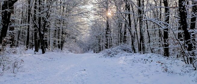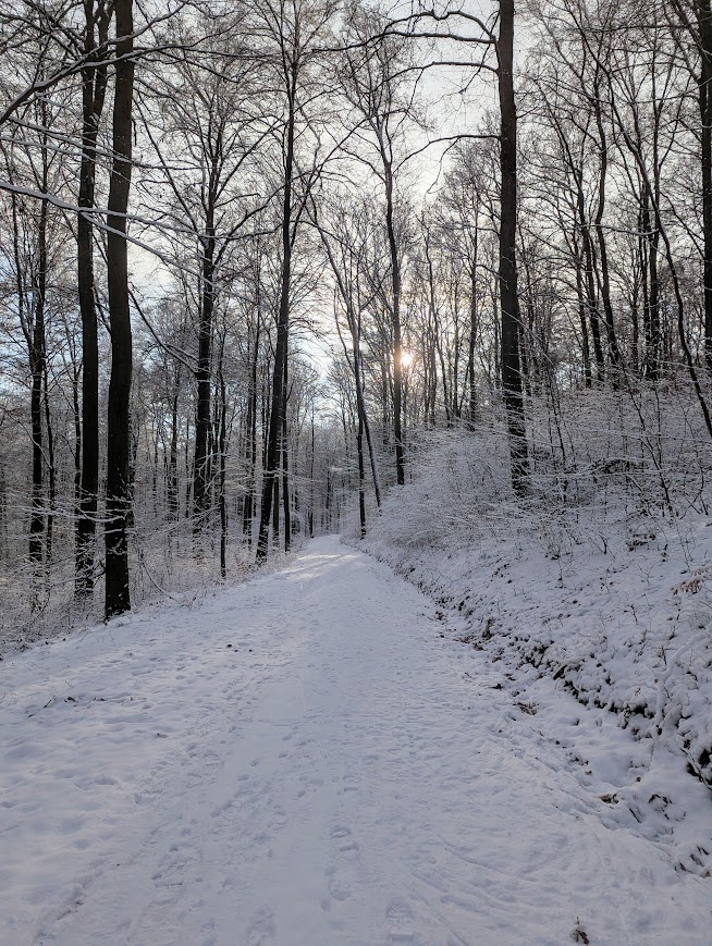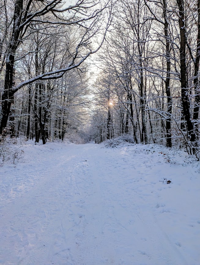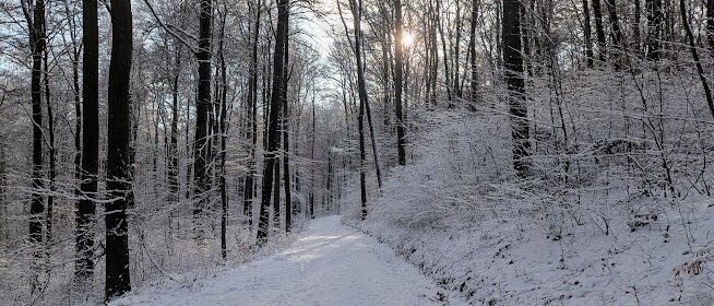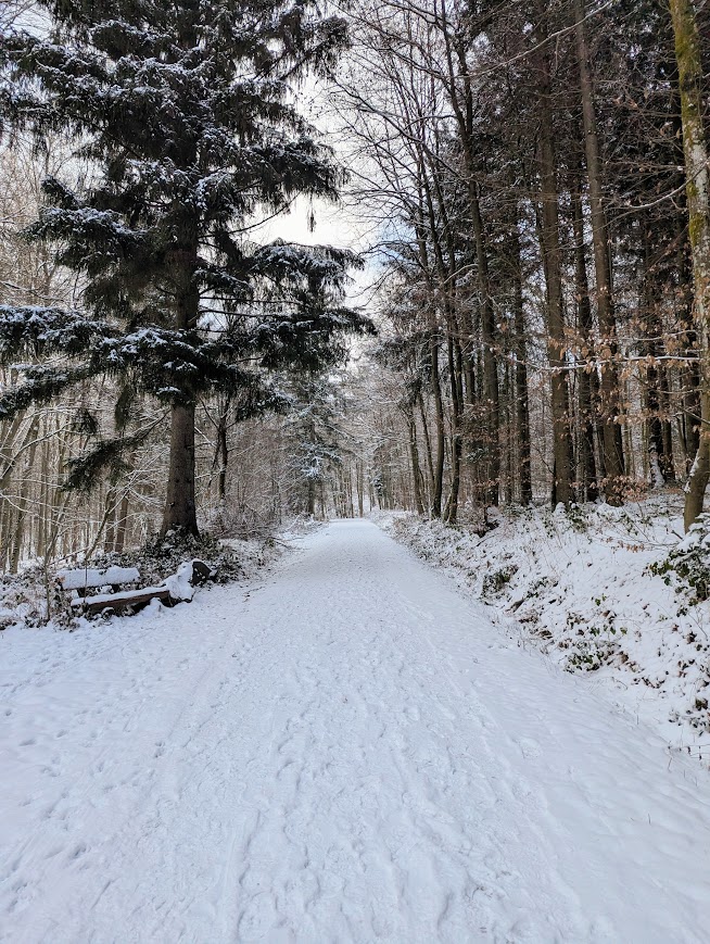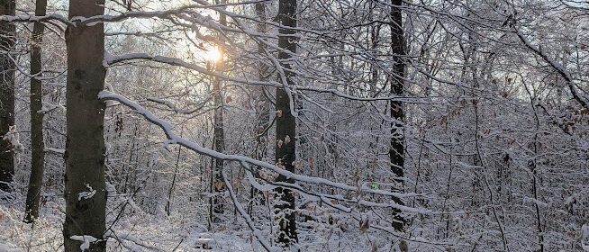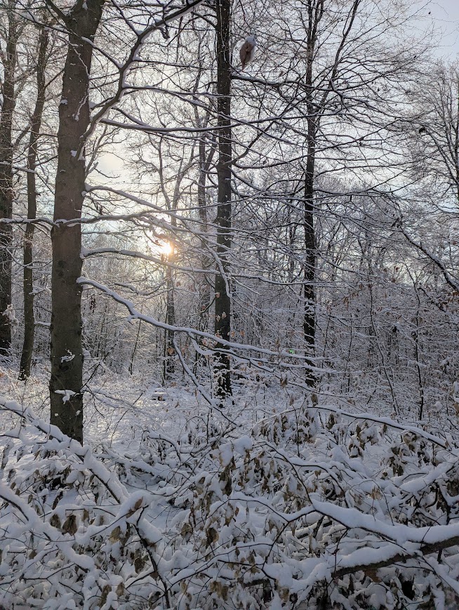 Es ist ein ganz eigenes Gehen in diesem recht hohen Schnee. Ich vernehme das Knirschen meiner Schritte, aber ansonsten scheint der Wald sämtliche Geräusche fernzuhalten. Zwischen den Ästen die Sonne, eine leuchtende Kugel.