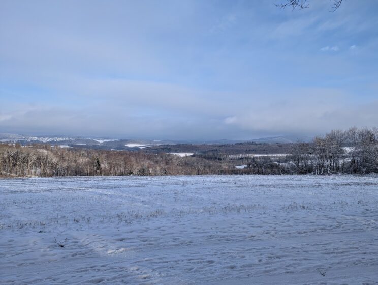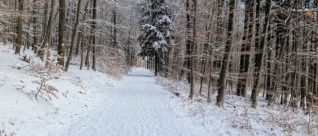 Vorbei an einer Waldwiese. Von den Schafen, die hier an wärmeren Tagen zu finden sind, ist nichts zu sehen.