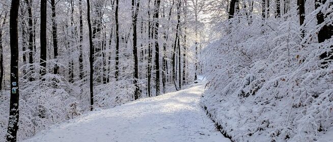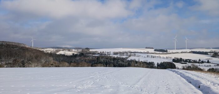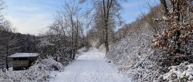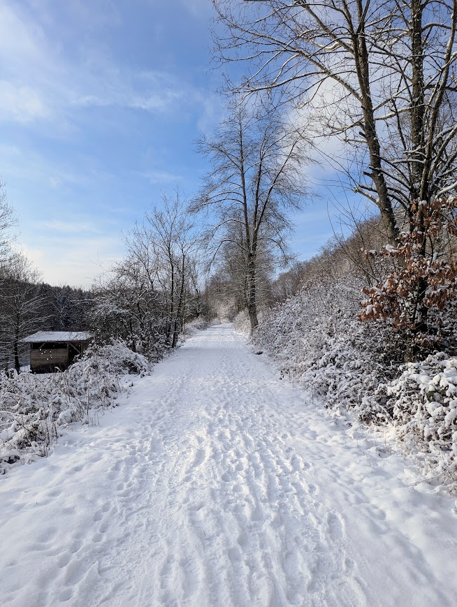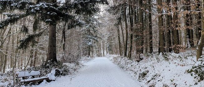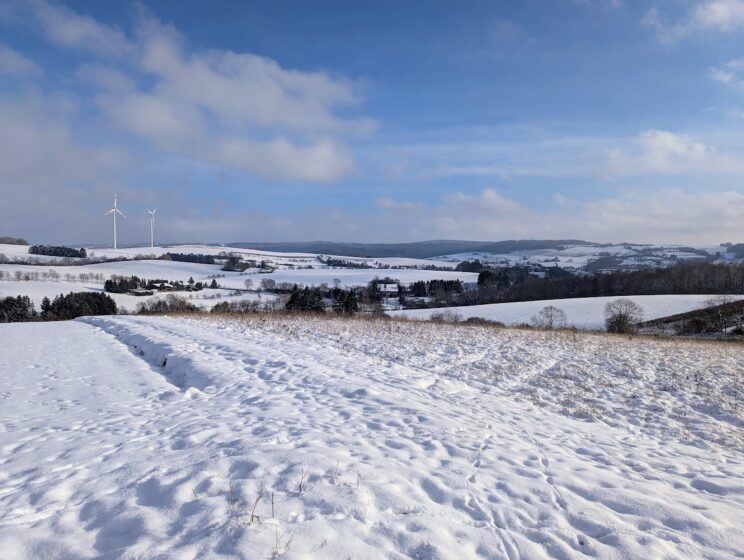 Ich wandere ein Stück auf Dirmingen zu. Auf dem festen Schnee lässt es sich problemlos gehen. Ein Läufer, der zwei Hunde bei sich führt, kommt mir entgegen. Bergauf erscheint das auch nicht allzu gefährlich. Bergab würde ich es mir heute zweimal überlegen, ob ich mich wirklich im Laufschritt voranbewegen muss.