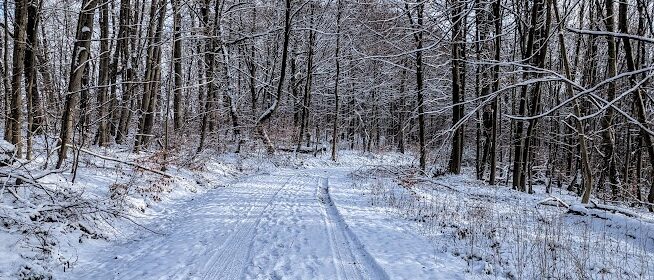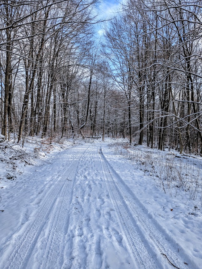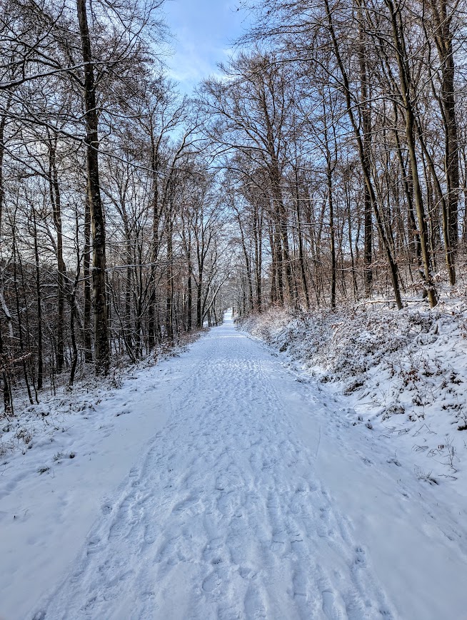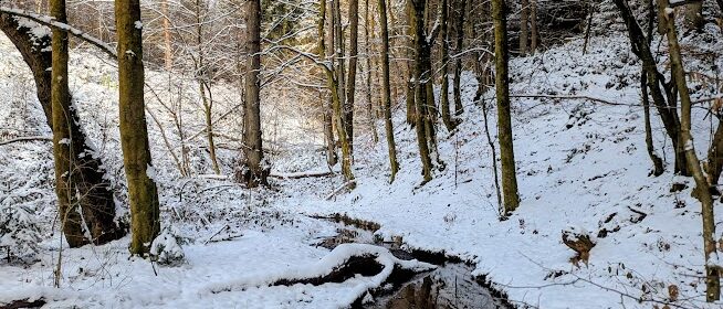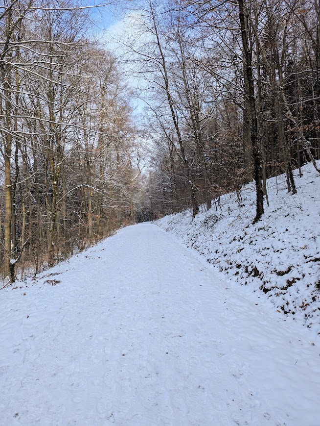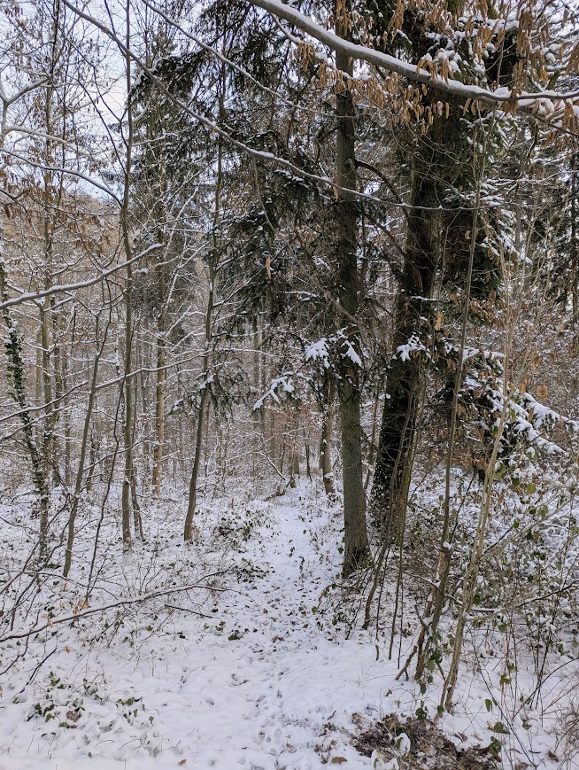 Bergab durch einen Wald, der nur sehr langsam von einem Winterwald zu einem Frühlingswald wird.