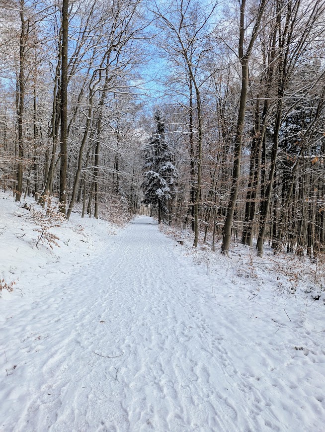 Zur Abwechslung mal wieder ein schmaler Pfad. Nur leise, ferne Straßengeräusche sind zu vernehmen, ansonsten besteht die Geräuschkulisse aus Spechtgetrommel und einem leichten Wind in den Baumkronen.