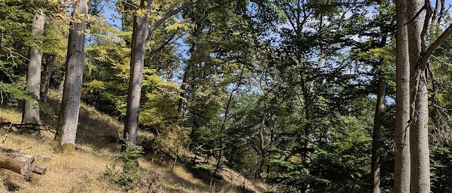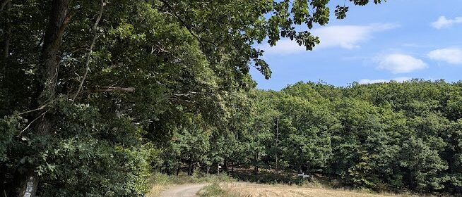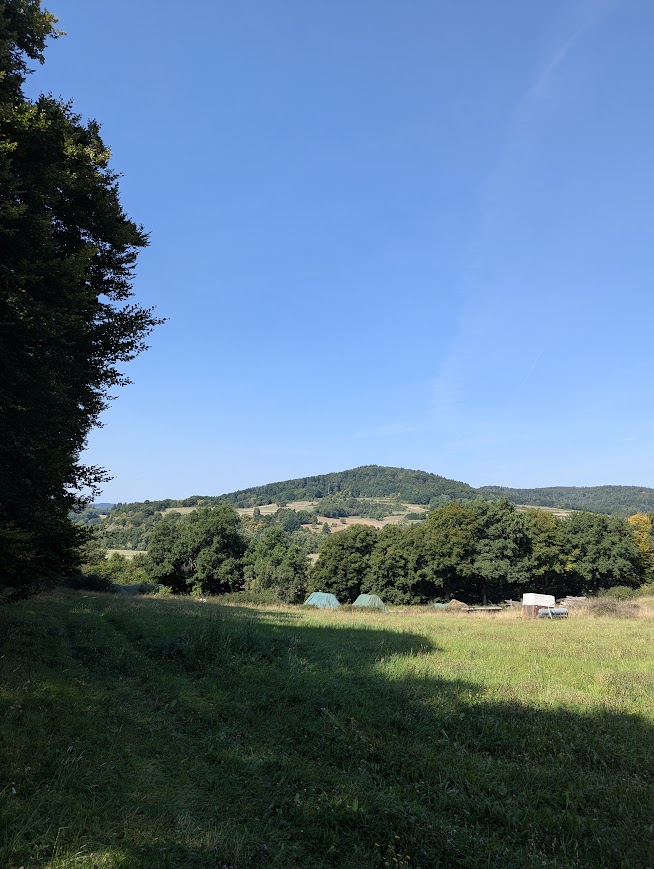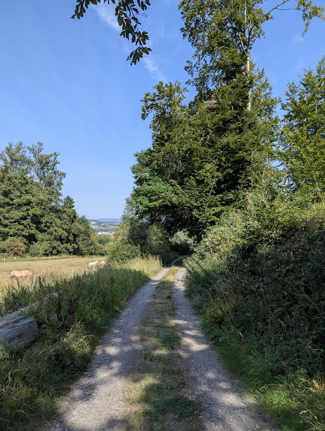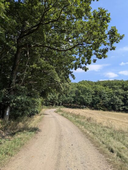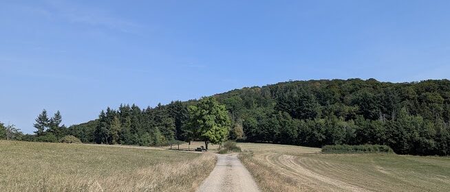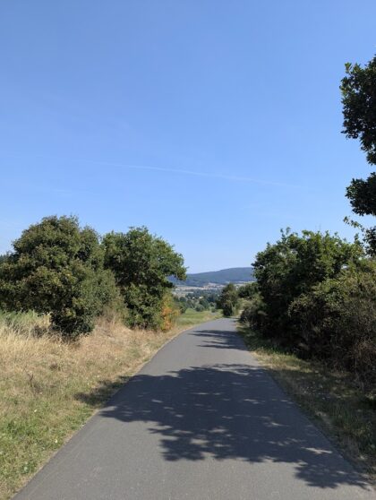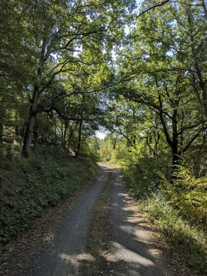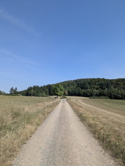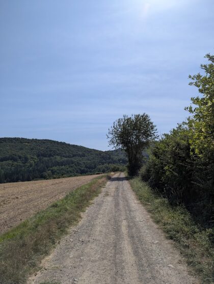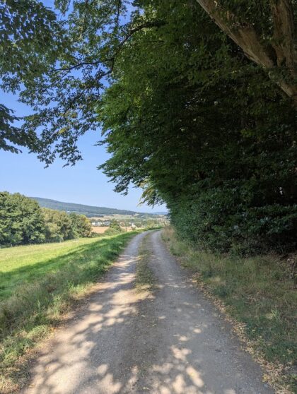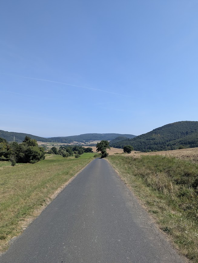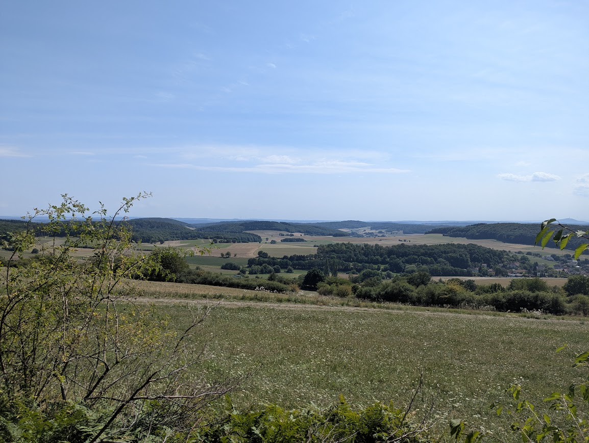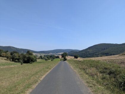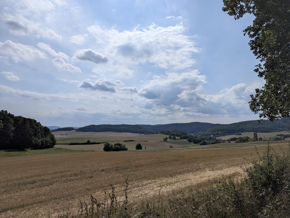Erste Fernblicke. Die Gegend ist sehr hügelig.