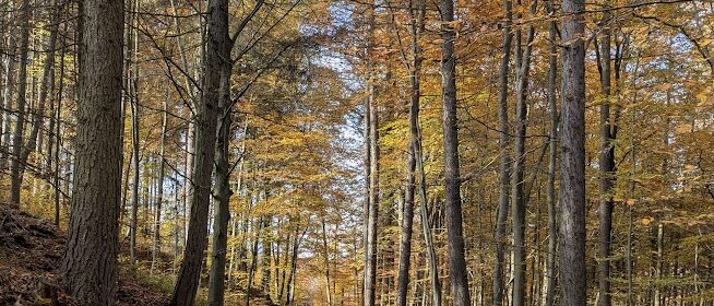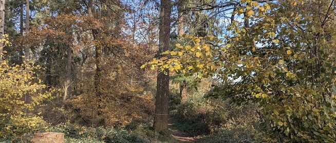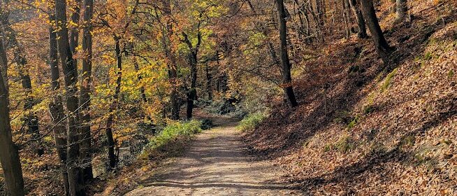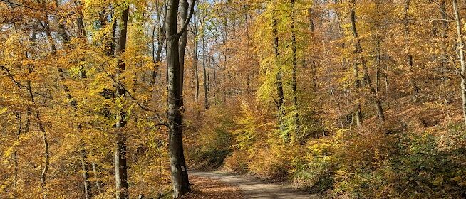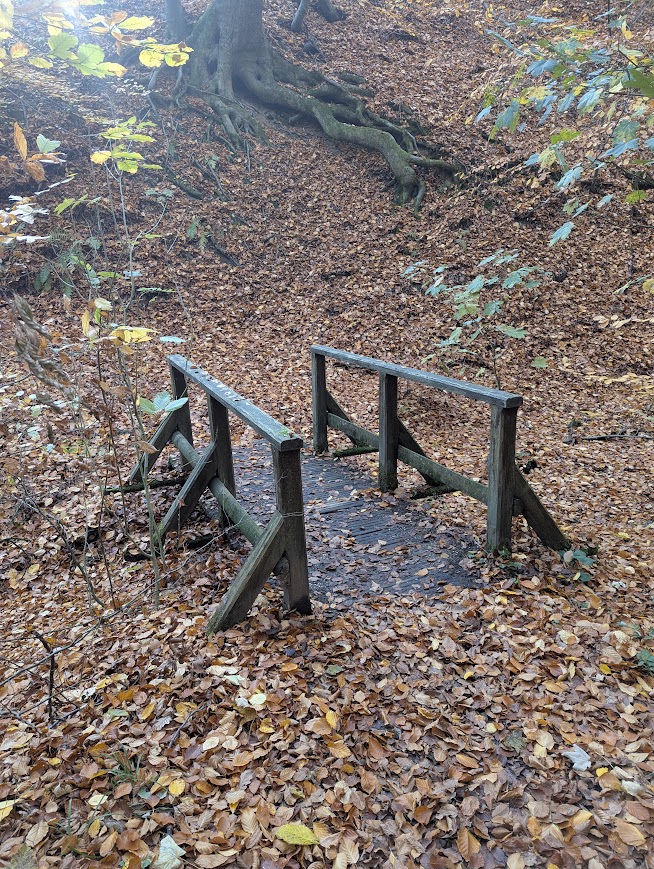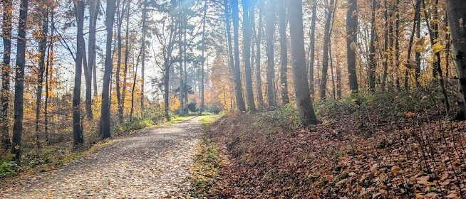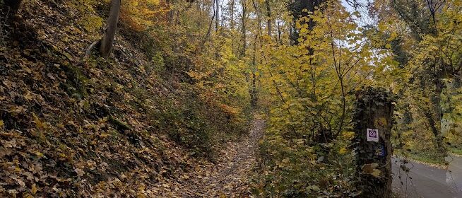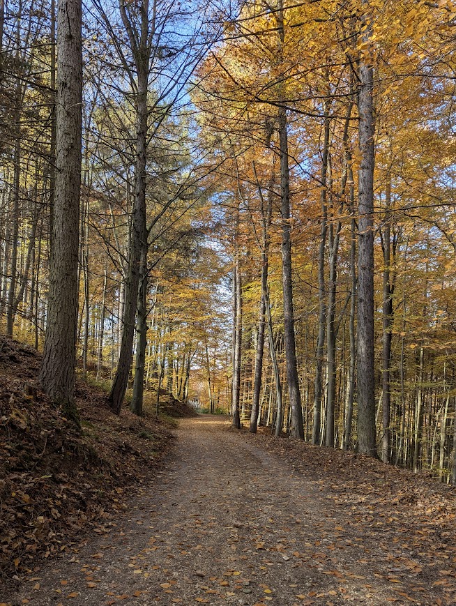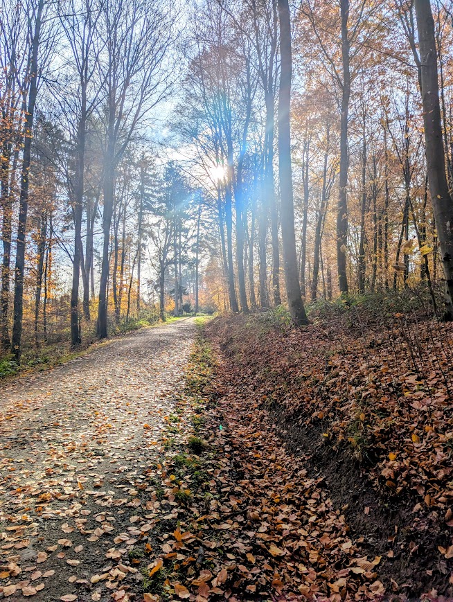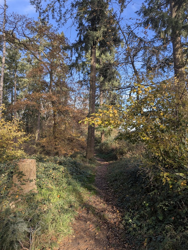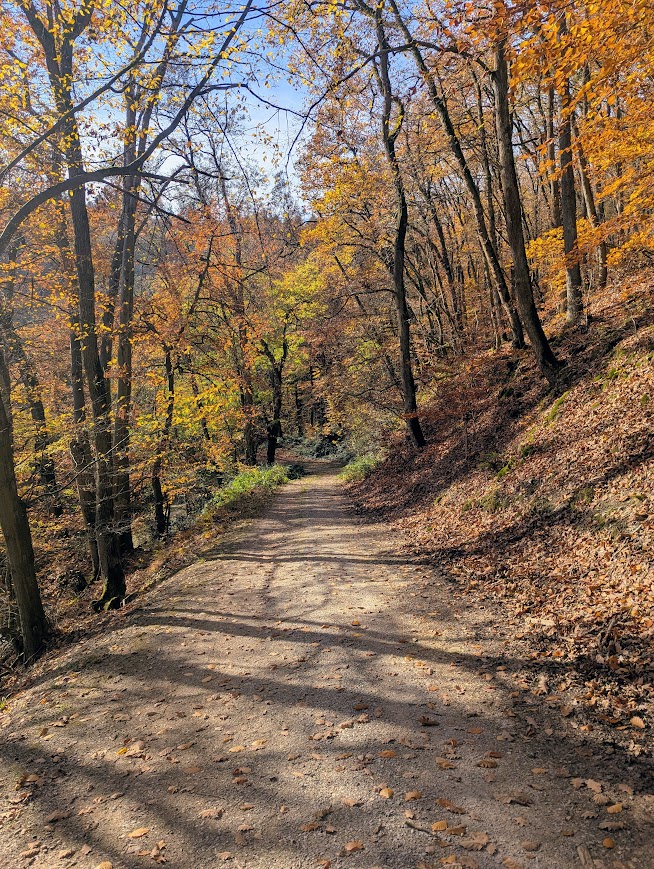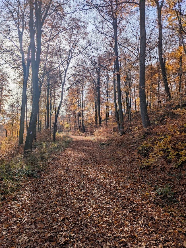 Nach vielen Kilometern mehr oder weniger breiter Waldschneisen endlich wieder schmale Pfade. Zunächst etwas schwer begehbar, da uneben, matschig, abschüssig und als unerquickliche Zugabe auch noch unter dem Laub versteckte Steine, dann aber angenehm und beinahe malerisch.