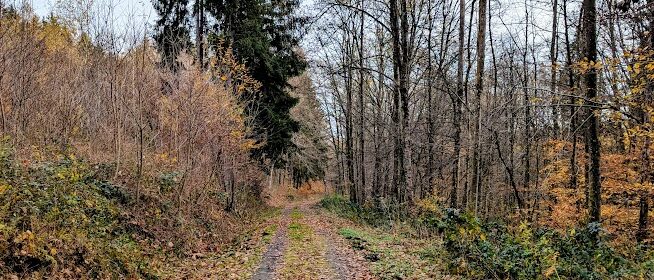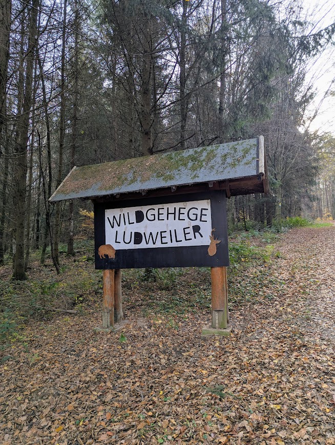 So sieht der Herbstwald hinter Dorf im Warndt aus. Zunächst also weder richtig sonnig noch richtig trüb. Ein leichter Wind streicht durch die Bäume. Die Stille ringsum ist nicht vollkommen, aber die hier und da hörbaren Geräusche sind vollkommen unaufdringlich. Am Rande des Weges ein verrottender Wegweiser des Saarland-Rundwanderweges, der mir fürs Erste als Orientierung dienen soll.