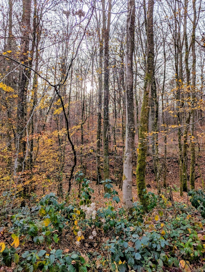 Zwischen den Bäumen eine warme, aber schon sehr niedrig stehende Herbstsonne