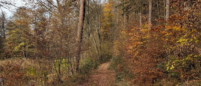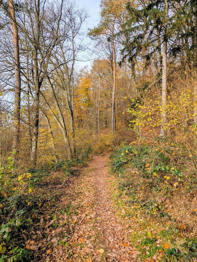 Am Rande von Geislautern, einem Stadtteil von Völklingen. Dieser Pfad entlang eines Weihers ist für längere Zeit der letzte schöne Anblick, denn danach wandere ich mehrere Kilometer weit durch Geislautern und das unmittelbar angrenzende Ludweiler. Nicht schlimm, es war vorher klar, dass ich in dieser dicht besiedelten Gegend keine ununterbrochenen Waldpfade vorfinden würde.