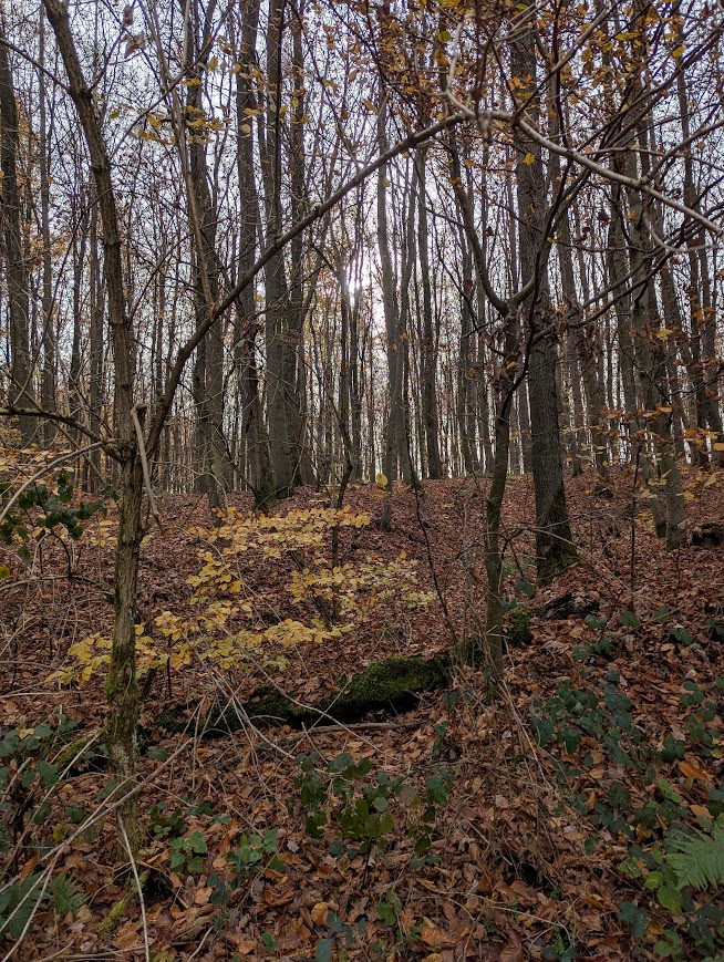 Wieder im Wald. Im Grunde ist es hell, aber zwischen den Bäumen ist das Licht matt und wird von den Baumschatten aufgesogen.