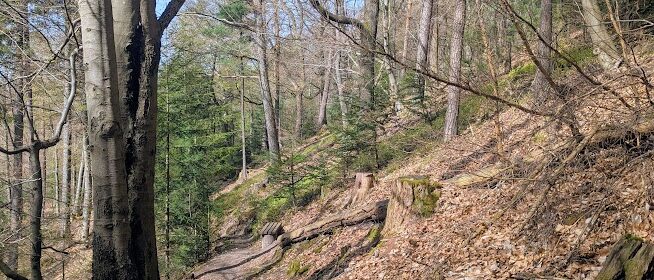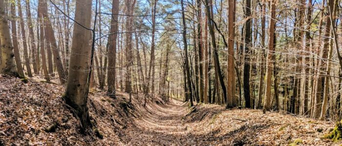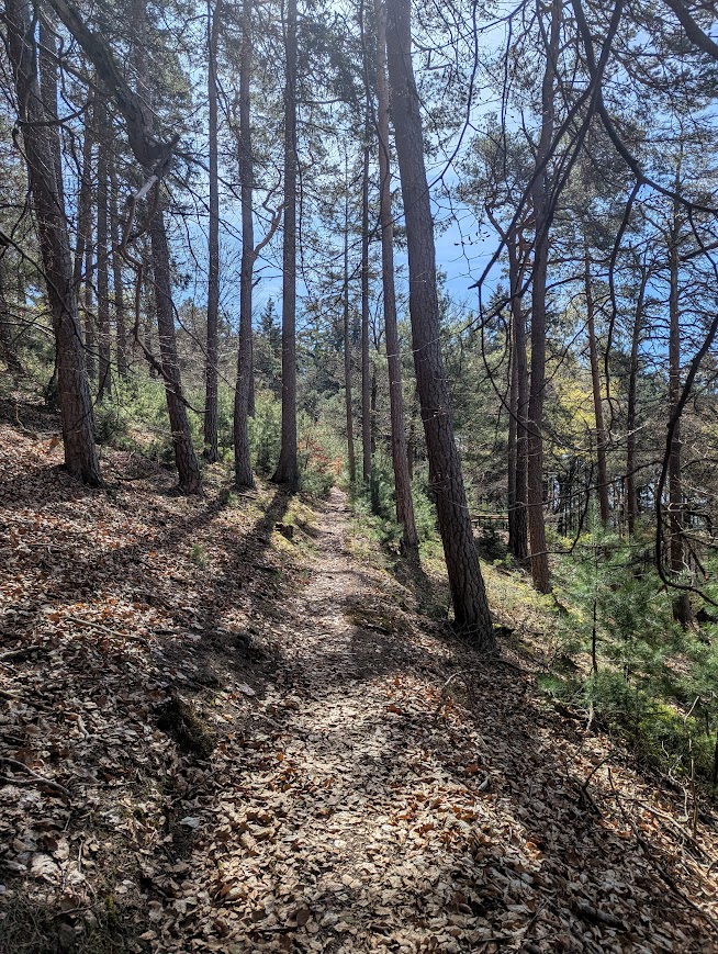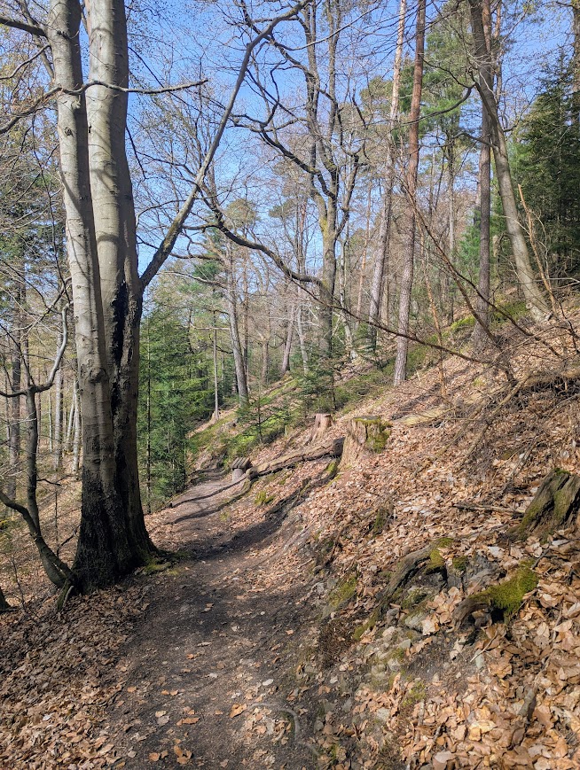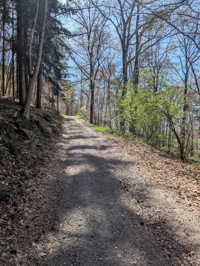 Kaum ist der Potzberg-Wanderweg erreicht, beginnt der Wald. Es geht stetig bergauf, meistens auf breiten Waldwegen, hier und da sind aber auch ein paar schmale Pfade eingestreut. Ich gehe weder schnell noch langsam, passe mein Tempo der Wegbeschaffenheit an. Das immer mehr sich ausbreitende Frühlingslicht eliminiert viele Schatten.