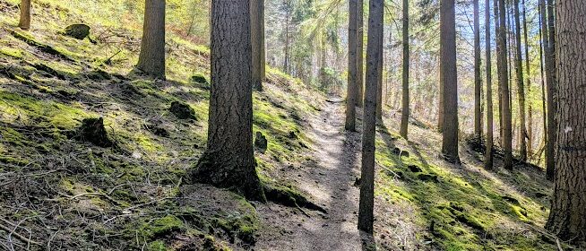 Überall Grün und überall von leichten Schatten durchzogene Lichtareale. Meine Aufmerksamkeit verharrt meistens auf dem Weg vor mir, nur wenn ich eine Gabelung oder Kreuzung vor mir bemerke, halte ich Ausschau nach Wegweisern oder dem Wandersymbol. Einmal übersehe ich eine Abzweigung und muss wieder umkehren, und an der einen oder anderen Stelle, wo es nötig wäre, findet sich kein Symbol oder vielleicht entdecke ich es auch einfach nicht. Insgesamt komme ich ohne große Schwierigkeiten voran.