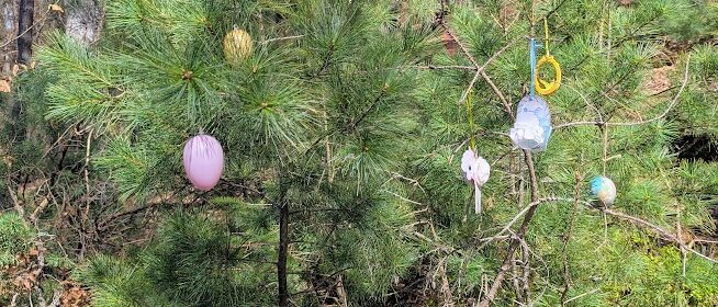 Ich mache mich auf den Weg ins Tal. „Wichtelpfad“ lese ich auf einem Schild, auf einem anderen steht „Zickzackpfad“. In Serpentinen und über viel Wurzelwerk geht es bergab. Von Zeit zu Zeit sehe ich Gegenstände. die an Bäumen aufgehängt oder am Wegrand platziert sind. Ein Wichtelpfad, wie gesagt.