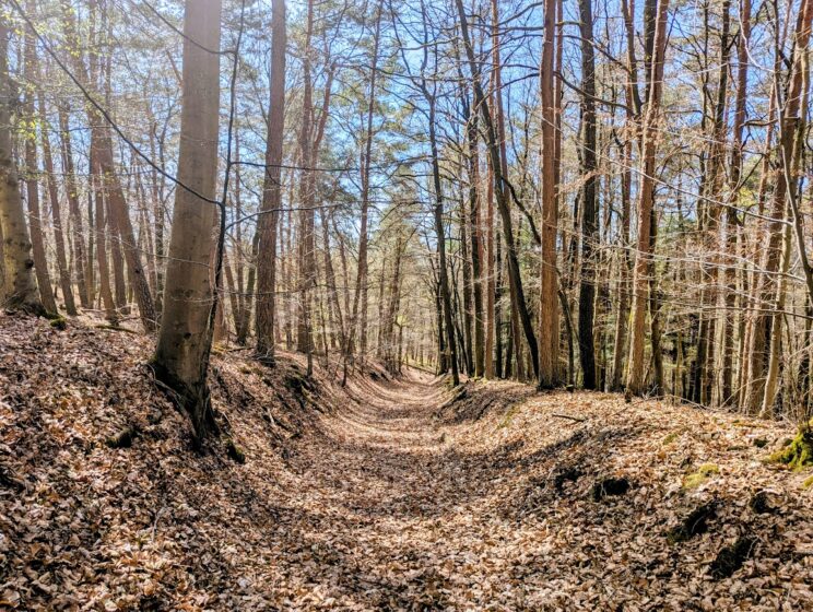 Am Wegrand jede Menge Schilder zu irgendwelchen Örtlichkeiten ringsum – Hütten, Brunnen usw. Irgendwann laufe ich an einer Stelle vorüber, an der es vor Jahrhunderten eine Burg gegeben haben soll, Burg Deinsberg. Viel ist allerdings nicht mehr übrig davon.