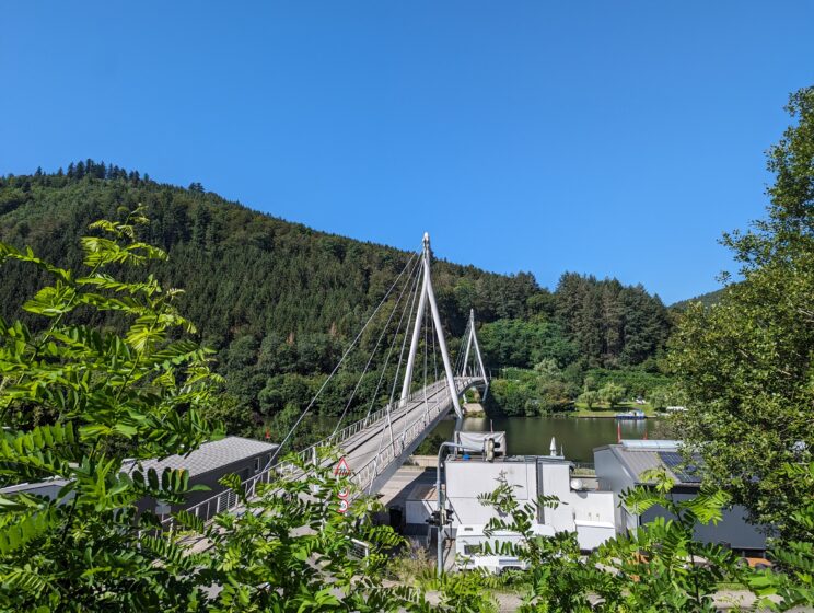 Blick von der 2014 eröffneten Fußgängerbrücke in Haßmersheim über den Neckar zu Burg Hornberg