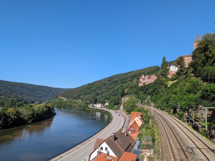 Blick über den Neckar auf Zwingenberg und Schloss Zwingenberg oberhalb des Ortes