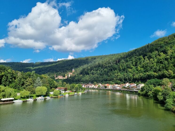 Blick über den Neckar auf Zwingenberg und Schloss Zwingenberg oberhalb des Ortes