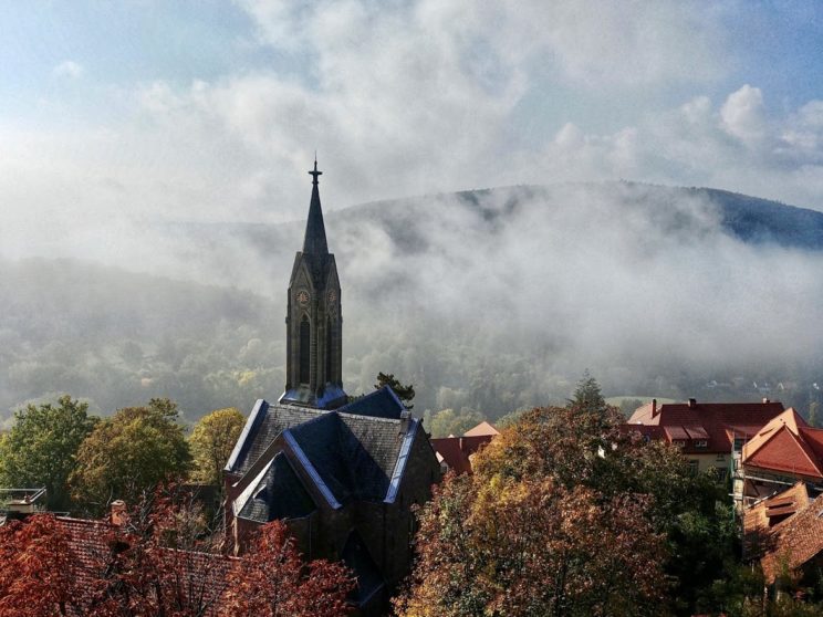 Der Ausblick von der Burgfeste ist phänomenal. Im Herbst legt sich mitunter Nebel übers Tal wie ein weiches Tuch. Im Sommer unter dem flimmernden Blau des Himmels sieht man auf das stille Grün der Hügel, das immer mehr verblasst, je weiter man den Blick in die Ferne richtet, und das sich schließlich am milchigen, wolkenweißen Rand des Horizonts verliert.