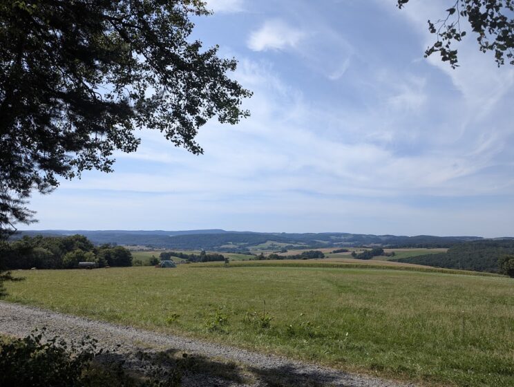 Auch diese Örtlichkeit befindet sich im hessischen Teil des Odenwalds. Von einer Anhöhe am Waldrand blickt man über Wiesen hinweg in eine stille Hügellandschaft. Unter Bäumen eine Bank samt Tisch, wo man sich niederlassen und den Ausblick auf sich wirken lassen kann. Auch die nähere Umgebung trägt mit viel Wald und jeder Menge stiller Pfade das ihre zu der wunderbaren Szenerie bei.